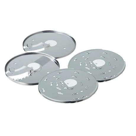 En plus de l’accessoire BlenderMix, vous trouverez : un couvercle à goulotte, un pétrin, un batteur à blanc, 2 couteaux en métal, une spatule et 4 disques pour émincer et râper.