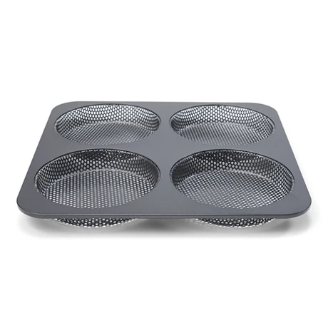 La plaque à 4 empreintes rondes de 12 cm de diamètre en acier revêtu perforé Pâtisse est un matériel de pâtisserie incontournable. Polyvalent, ce moule permet de confectionner des pains à burger, des briochettes, des tartelettes ou toute autre préparation ronde selon vos envies.