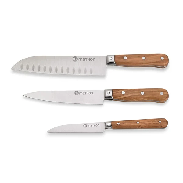 Ce set de 3 couteaux de la marque Mathon est complet, il se compose d’un couteau d’office, d’un couteau de chef et d’un couteau santoku.