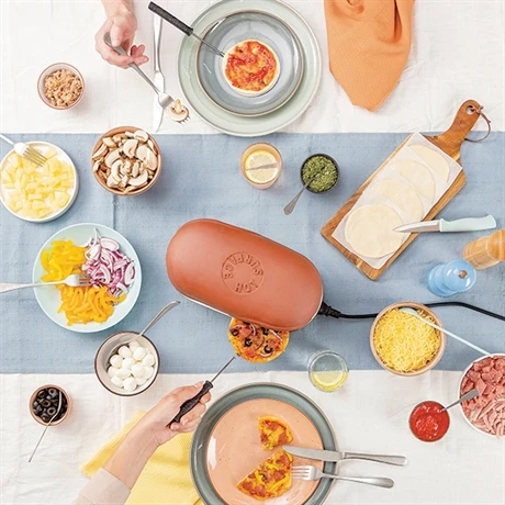 Quatre saisons, Reine, Sicilienne, Margherita ou Fraise, Chocolat, Pomme-cannelle, ces délicieuses pizzas se réalisent désormais à la maison avec le four à pizza électrique 2 personnes Pizza Festa Connect 530 W marron ; laissez parler votre gourmandise. Les enfants vont adorer confectionner leurs mini-pizzas et vous allez pouvoir organiser une pizza-party en duo romantique ou avec des amis en connectant un appareil supplémentaire. Croustillantes et moelleuses, on les dirait tout droit sorties d’un four à pizza traditionnel, elles vont bluffer tous les amateurs de cuisine italienne ; inventez vos pizzas, garnissez, cuisez et régalez-vous !
